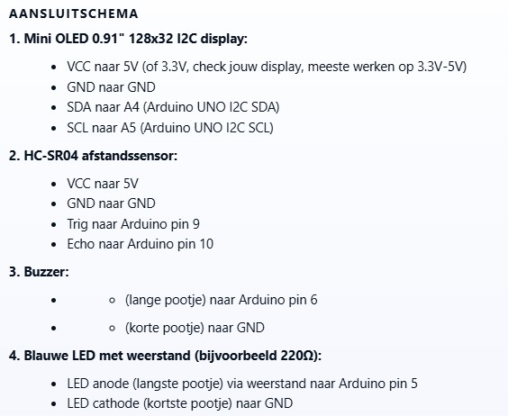 Ik heb een Arduino UNO R3 en een Mini OLED 0.91 128×32 I2C inch display een hc-sr04 afstandssensor een buzzer en een LED ‘blauw’.