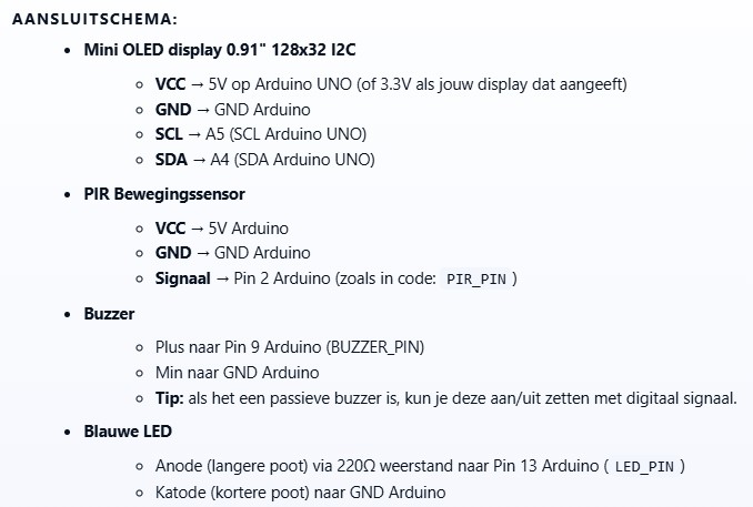 Ik heb een Arduino UNO R3 en een Mini OLED 0.91 128×32 I2C inch display een PIR bewegingssensor een buzzer en een LED ‘blauw’.