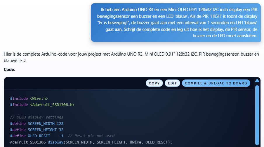 Ik heb CODEY gevraagd om de complete code te schrijven én mij te vertellen hoe ik de componenten moet aansluiten.