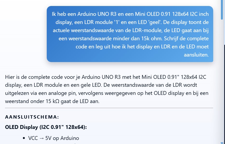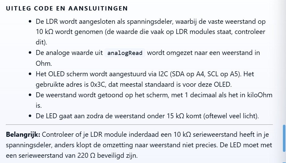 Ik heb een Arduino UNO R3 en een Mini OLED 0.91 128×64 I2C inch display, een LDR module ‘1’ en een LED ‘geel’. De display toont de actuele weerstandswaarde van de LDR-module, de LED gaat aan bij een weerstandswaarde minder dan 15k ohm. Schrijf de complete code en leg uit hoe ik het display en LDR en de LED moet aansluiten.