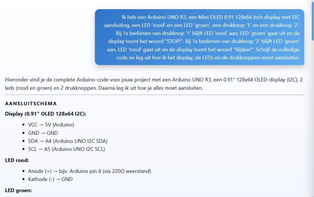 Ik heb een Arduino UNO R3, een Mini OLED 0.91 128×64 inch display met I2C aansluiting, een LED ‘rood’ en een LED ‘groen’, een drukknop ‘1’ en een drukknop ‘2’. Bij 1x bedienen van drukknop ‘1’ blijft LED ‘rood’ aan, LED ‘groen’ gaat uit en de display toont het woord “STOP!”. Bij 1x bedienen van drukknop ‘2’ blijft LED ‘groen’ aan, LED ‘rood’ gaat uit en de display toont het woord “Rijden!”. Schrijf de volledige code en leg uit hoe ik het display, de LEDs en de drukknoppen moet aansluiten.