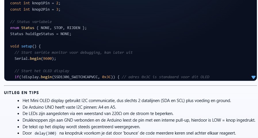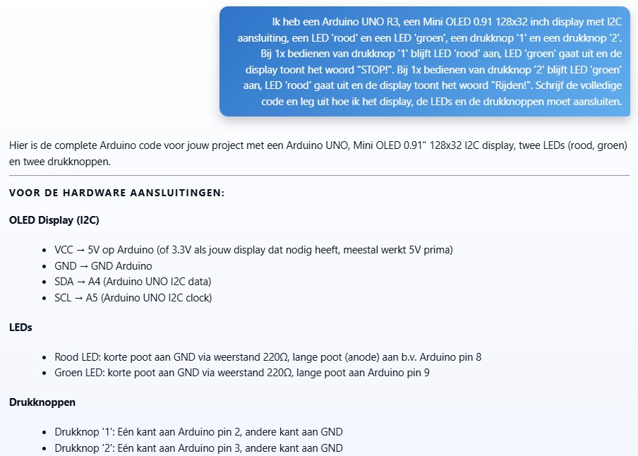 Ik heb een Arduino UNO R3, een Mini OLED 0.91 128×32 inch display met I2C aansluiting, een LED ‘rood’ en een LED ‘groen’, een drukknop ‘1’ en een drukknop ‘2’. Bij 1x bedienen van drukknop ‘1’ blijft LED ‘rood’ aan, LED ‘groen’ gaat uit en de display toont het woord “STOP!”. Bij 1x bedienen van drukknop ‘2’ blijft LED ‘groen’ aan, LED ‘rood’ gaat uit en de display toont het woord “Rijden!”. Schrijf de volledige code en leg uit hoe ik het display, de LEDs en de drukknoppen moet aansluiten.