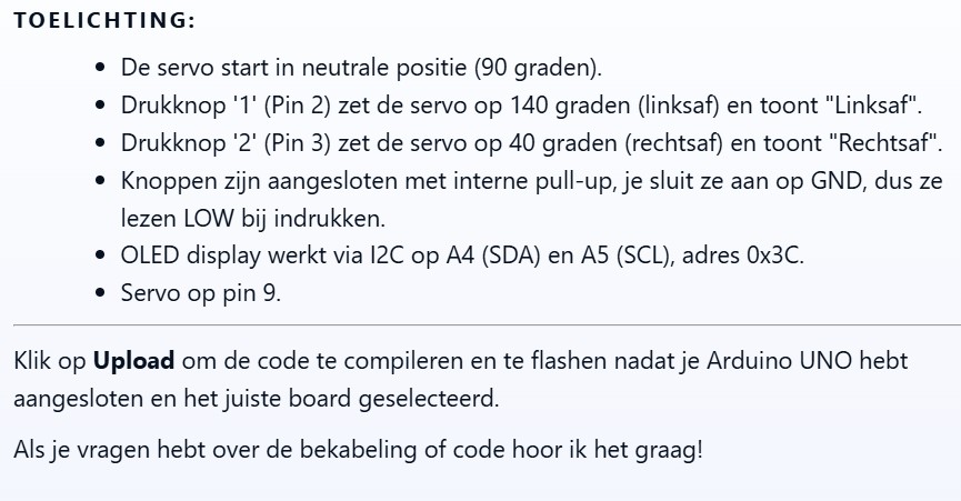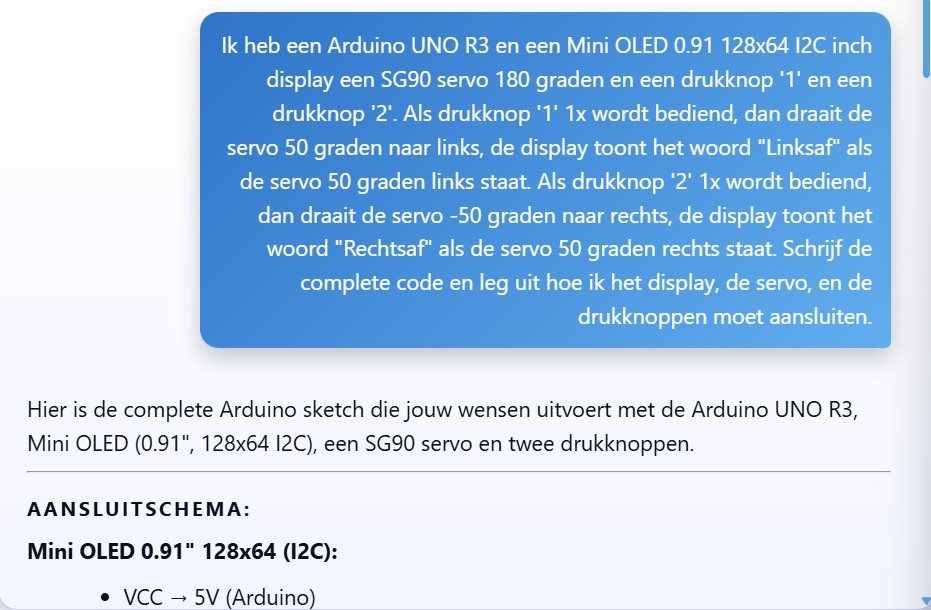 Ik heb een Arduino UNO R3 en een Mini OLED 0.91 128×64 I2C inch display een SG90 servo 180 graden en een drukknop ‘1’ en een drukknop ‘2’. Als drukknop ‘1’ 1x wordt bediend, dan draait de servo 50 graden naar links, de display toont het woord “Linksaf” als de servo 50 graden links staat. Als drukknop ‘2’ 1x wordt bediend, dan draait de servo -50 graden naar rechts, de display toont het woord “Rechtsaf” als de servo 50 graden rechts staat. Schrijf de complete code en leg uit hoe ik het display, de servo, en de drukknoppen moet aansluiten.