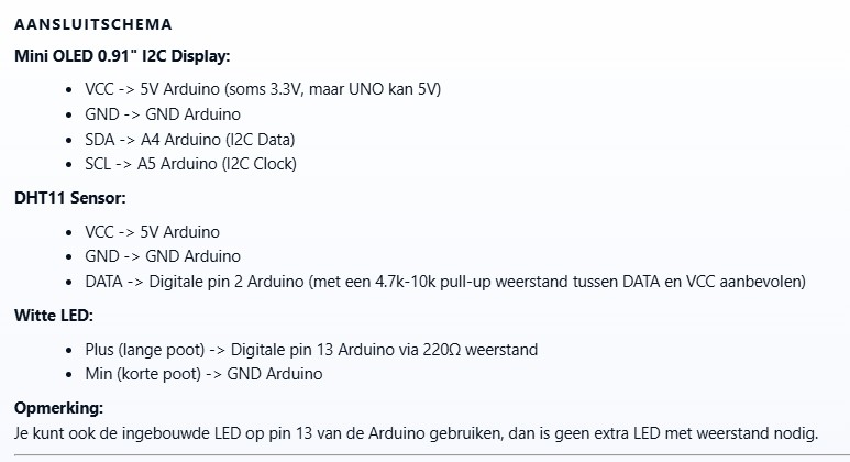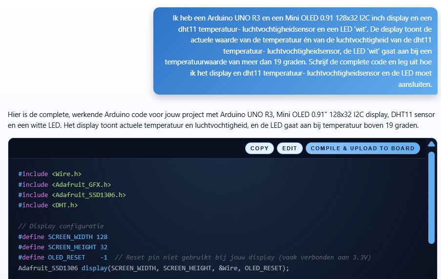 Ik heb een Arduino UNO R3 en een Mini OLED 0.91 128×32 I2C inch display en een dht11 temperatuur- luchtvochtigheidsensor en een LED ‘wit’. De display toont de actuele waarde van de temperatuur én van de luchtvochtigheid van de dht11 temperatuur- luchtvochtigheidsensor, de LED ‘wit’ gaat aan bij een temperatuurwaarde van meer dan 19 graden. Schrijf de complete code en leg uit hoe ik het display en dht11 temperatuur- luchtvochtigheidsensor en de LED moet aansluiten.