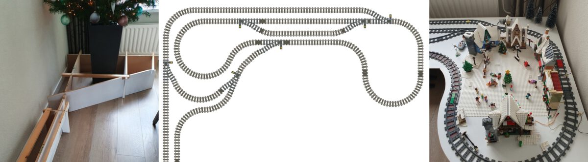 De kerstbaan heeft twee tracks met twee verbindingsbogen. De linker boog loopt rond de kerstboom. De rechter boog is voor de huizen in het dorp. Tussen beide bogen vormen de 2 wissels het station. Dit is nodig omdat er 3 treinen gaan rijden.