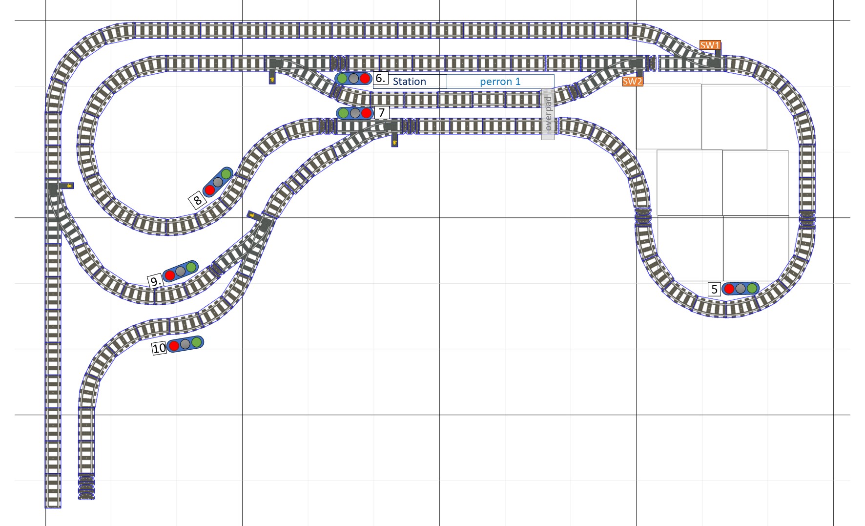 Zoals je kunt zien zijn er GEEN keerlussen meer. De treinen rijden altijd in dezelfde richting. Behalve natuurlijk als de treinen het rangeerterrein op gaan, dan rijden ze achteruit om wagons of rijtuigen te kunnen koppelen of ontkoppelen.