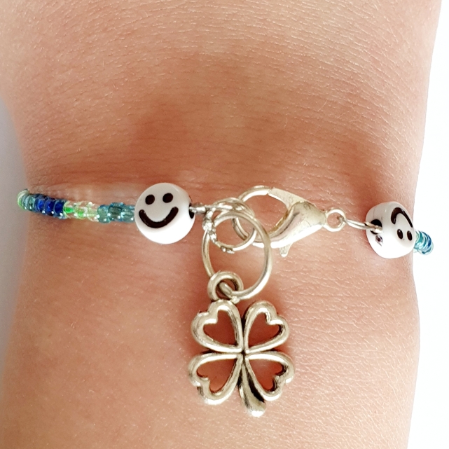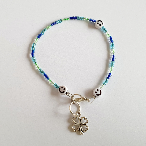 Armband – blauwkleurig met smileys en klaverblad als hanger.
