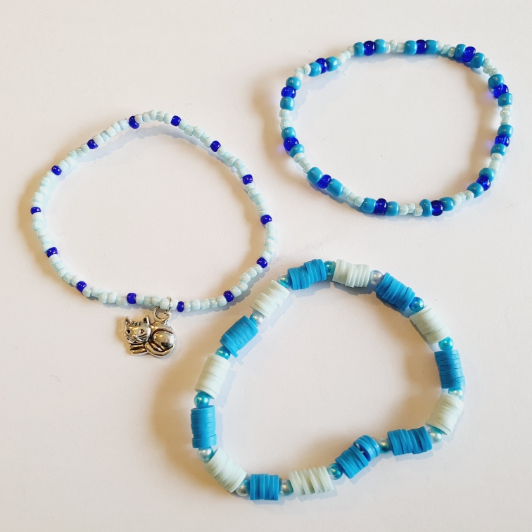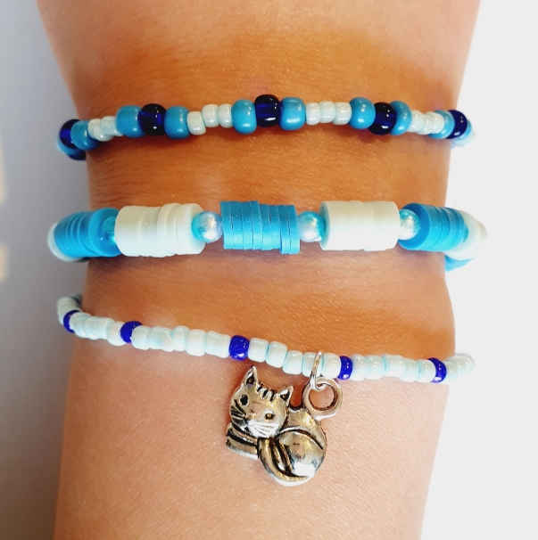 Set met 3 blauw kleurige armbandjes waarvan 1 met poesje als hanger.