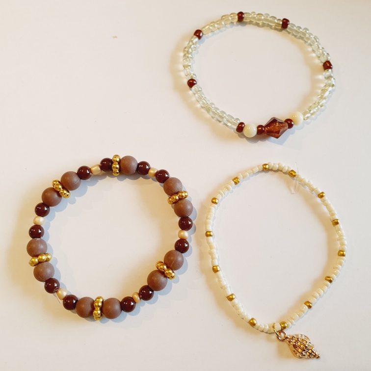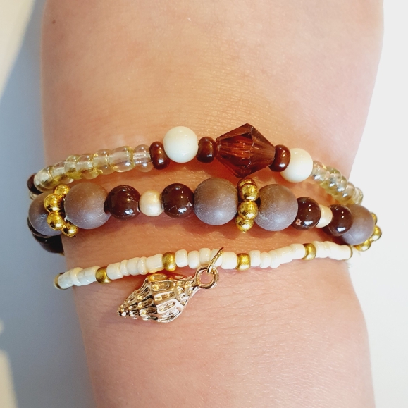 Set met 3 bruinkleurige armbandjes waarvan 1 met schelp hanger.